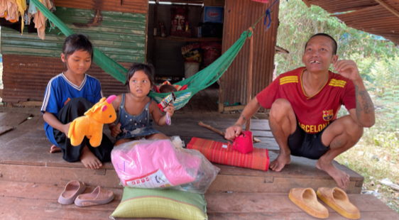 We have provided food parcels to Mr. Chea Soeng, 35 years old, who is living with a mental health condition, and his wife, Ms. Sor Mouern, 32 years old, who works as a fish processing worker. They have three children and are living in very poor conditions, struggling to meet their basic needs.